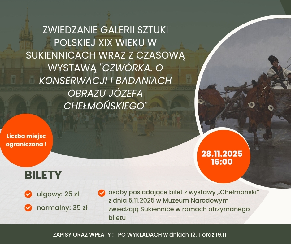 Informacja o wycieczce – zwiedzanie Galerii Sztuki Polskiej XIX wieku w Sukiennicach wraz z czasową wystawą „Czwórka. O konserwacji i badaniach obrazu Józefa Chełmońskiego” (28.11.2025)